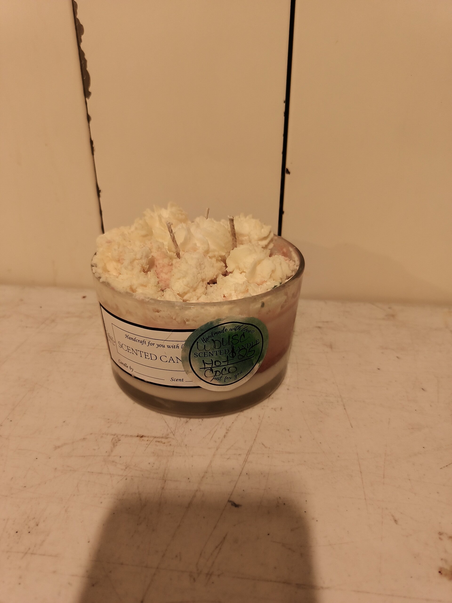 smell like frsh brewed hot chocolate, hand made with love using soy wax, the candle is brown with white whipped cream topping.